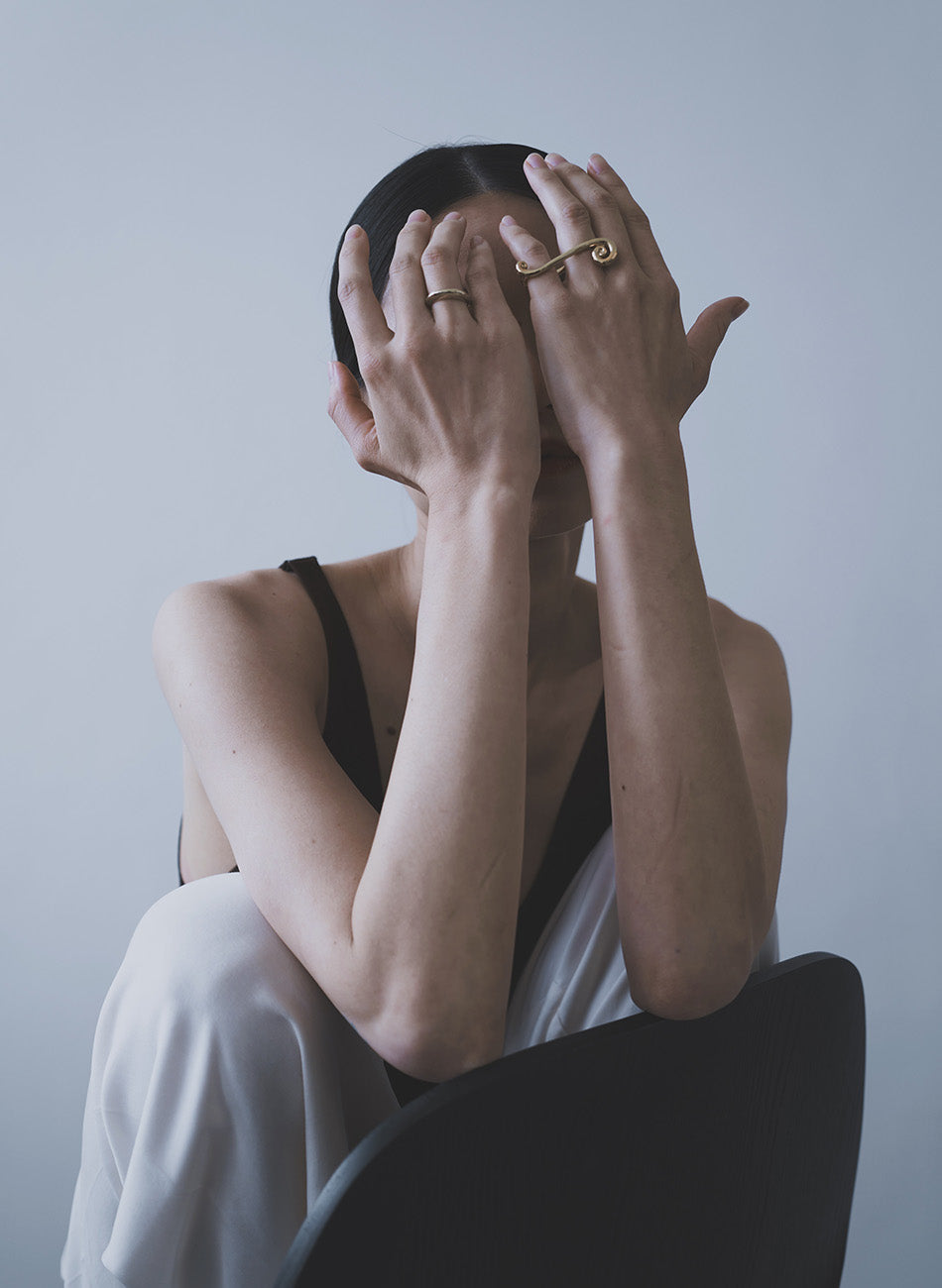 The spiral line that spans across two fingers moves like a musical note, Its asymmetrical curves creating a striking presence. It rests naturally along the hand, revealing a unique silhouette where softness and strength coexist.